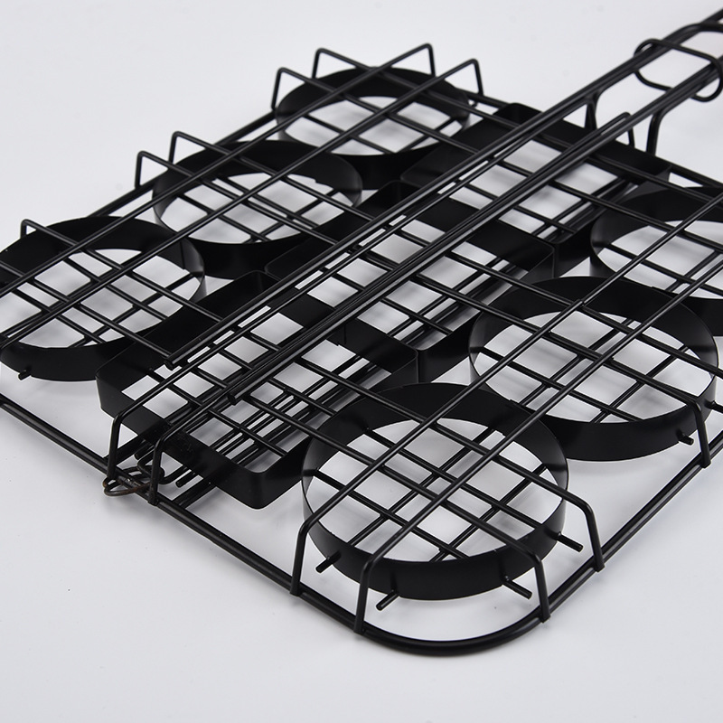 – Antihaftbeschichteter Grillkorb mit einzelnen Patty-Einsätzen.